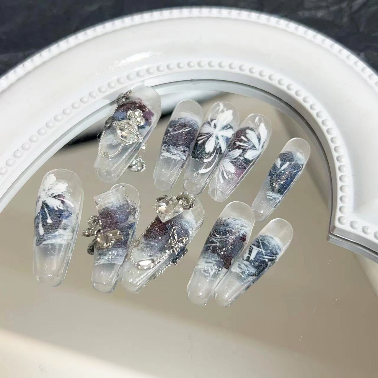 纯手工美甲穿戴甲假指甲贴片高级个性黑色水墨丝带锁链金属魔镜
