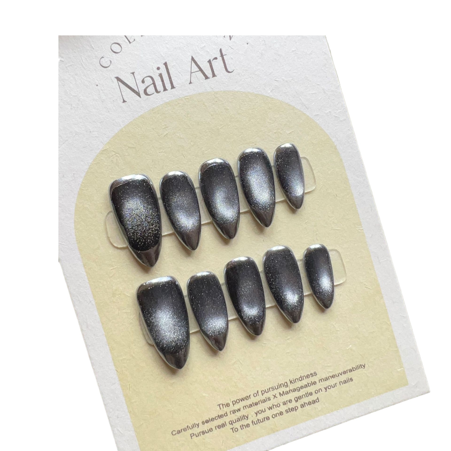 手工美甲穿戴甲假指甲贴片新款个性女王美甲追光猫眼小众银色魔镜