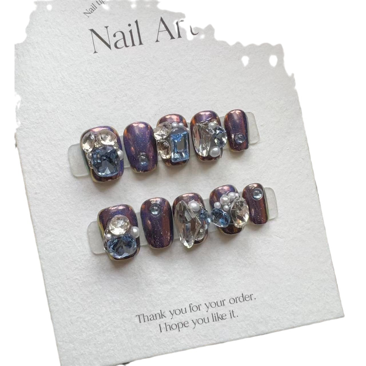 穿戴甲纯手工美甲成品假指甲贴片炫酷萤石紫色猫眼爆闪钻轻奢短款