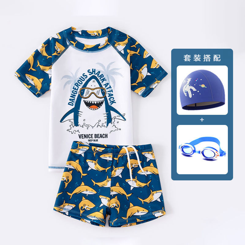 儿童分体短袖泳衣男童夏季可爱鲨鱼防晒速干中小童泳衣裤套装