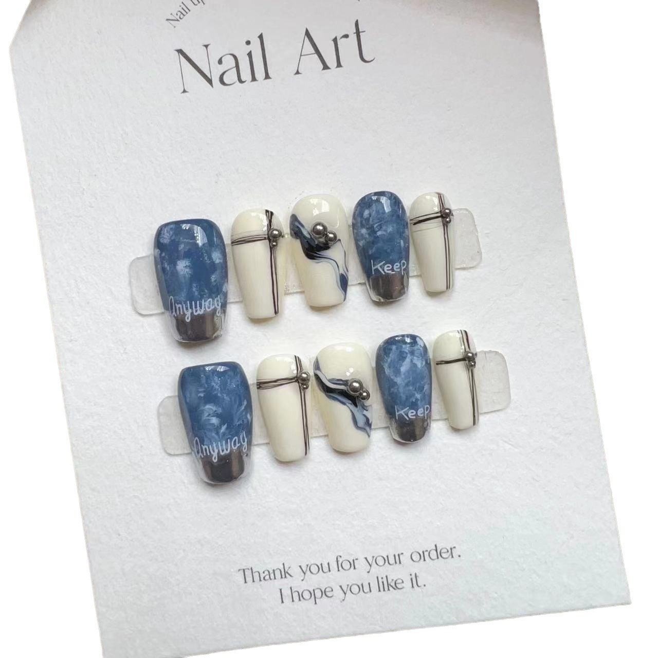 穿戴甲纯手工美甲成品假指甲贴片雾霾蓝海波纹温柔飘带魔镜字母钻