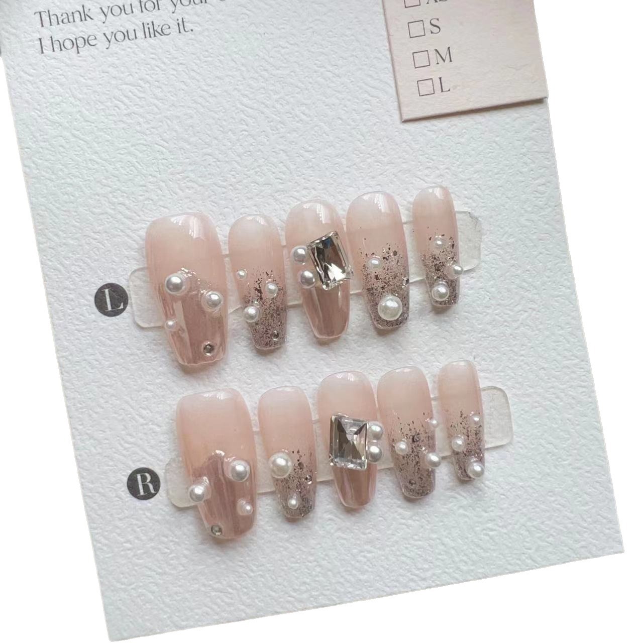 穿戴甲纯手工美甲成品假指甲贴片裸色纯欲风法式魔镜粉渐变爆闪钻
