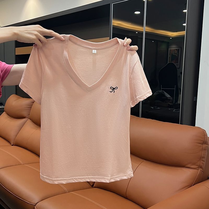 新款短袖T恤女夏季蝴蝶结设计刺绣修身显瘦百搭上衣