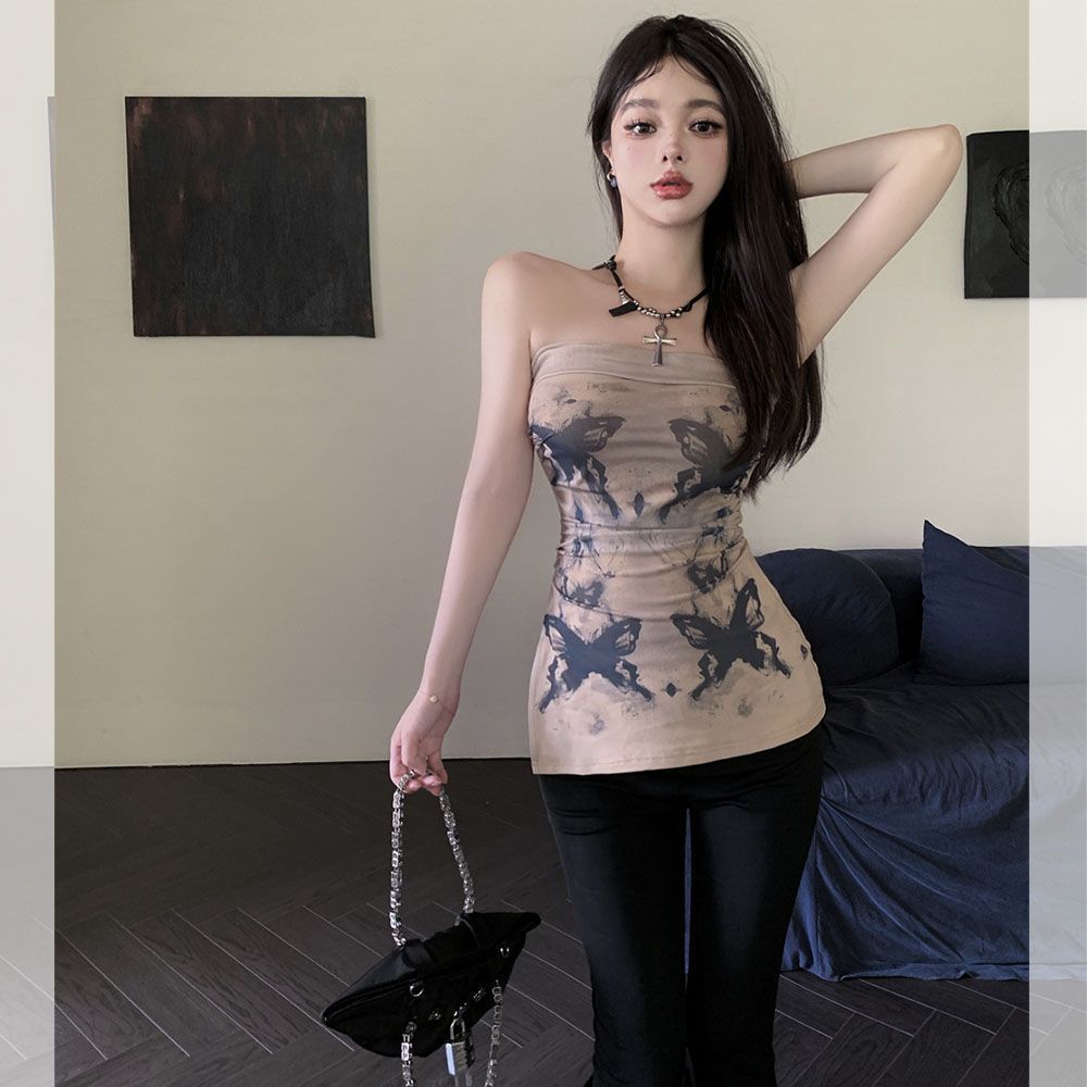 【月销10万】复古蝴蝶水墨抹胸上衣挂脖吊带背心纯欲新款修身内搭