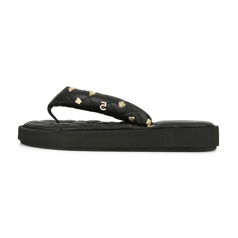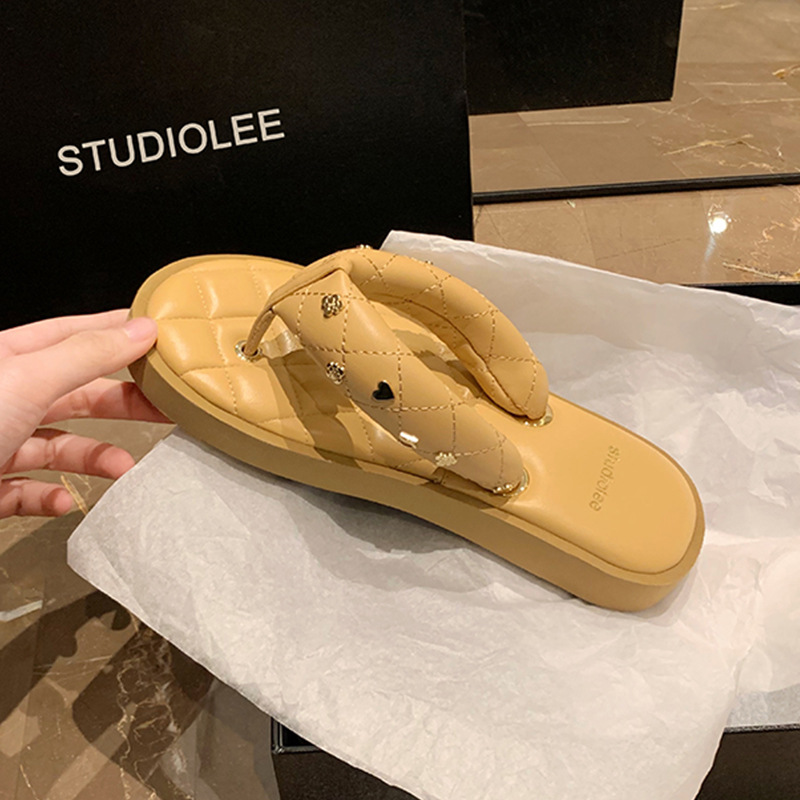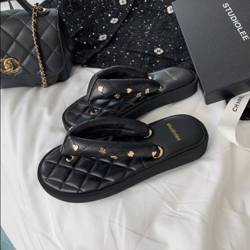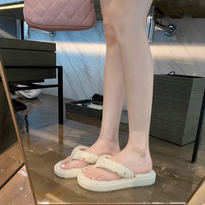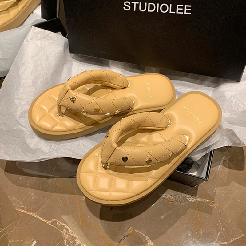 菱格夹趾真皮软底休闲外穿面包拖鞋女夏季新款