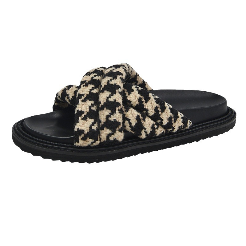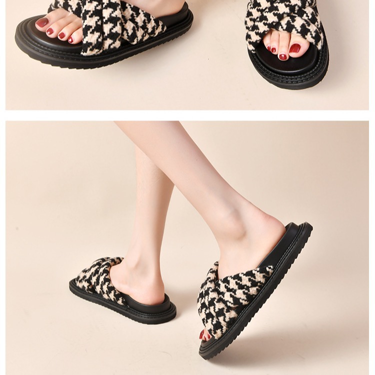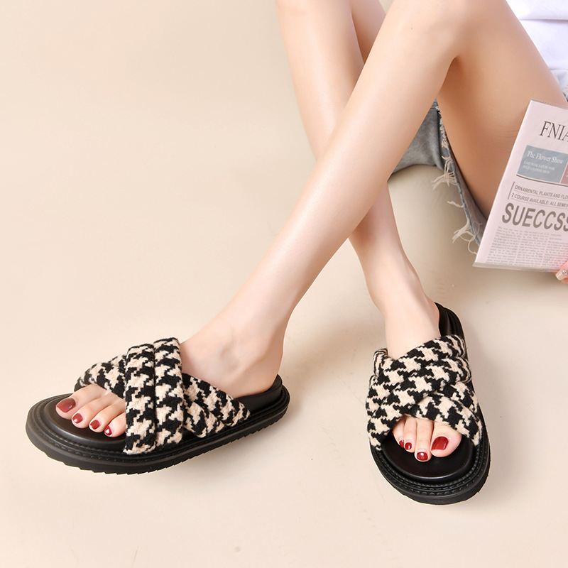 休闲交叉拖鞋春夏外穿新款时尚ins风千鸟格女鞋厚底网红拖鞋