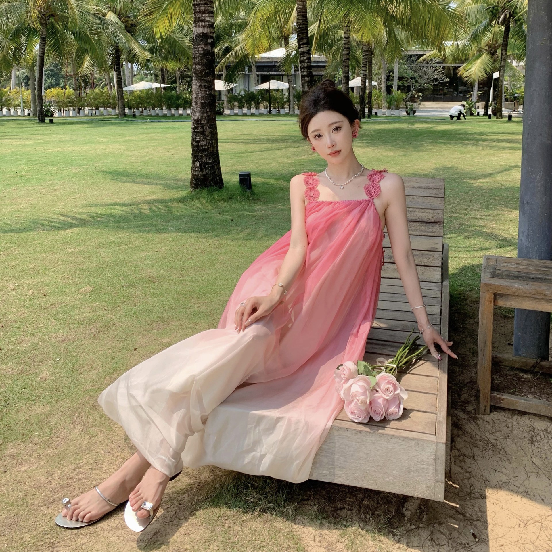 夏季度假拍照沙滩长裙海边粉色渐变吊带真丝长裙立体绣花超仙