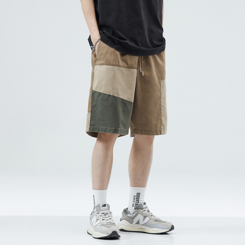 新夏季薄款短裤男潮流拼接撞色外穿五分休闲裤卡其现货五分裤