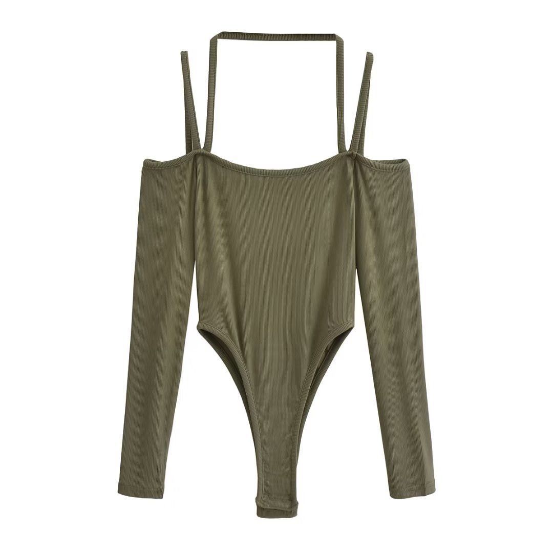 【跨境批发】欧美风新款纯欲辣妹性感一字肩挂脖吊带设计感连体衣