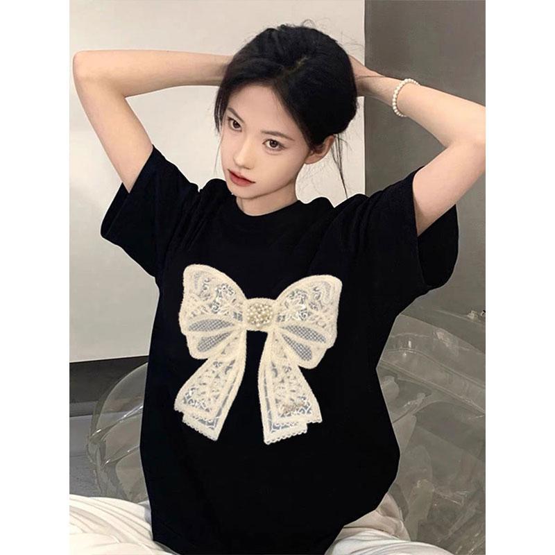 黑色短袖女t恤新款小众珍珠蕾丝蝴蝶结设计别致宽松休闲上衣