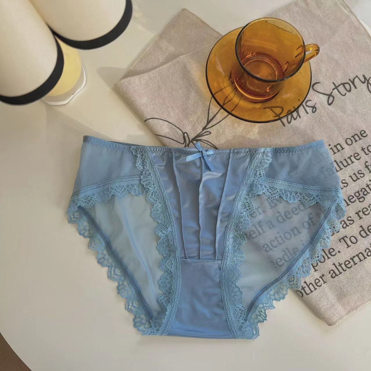 法式复古缎面白色内裤女纯欲蕾丝性感网纱纯棉裆三角裤中低腰薄款