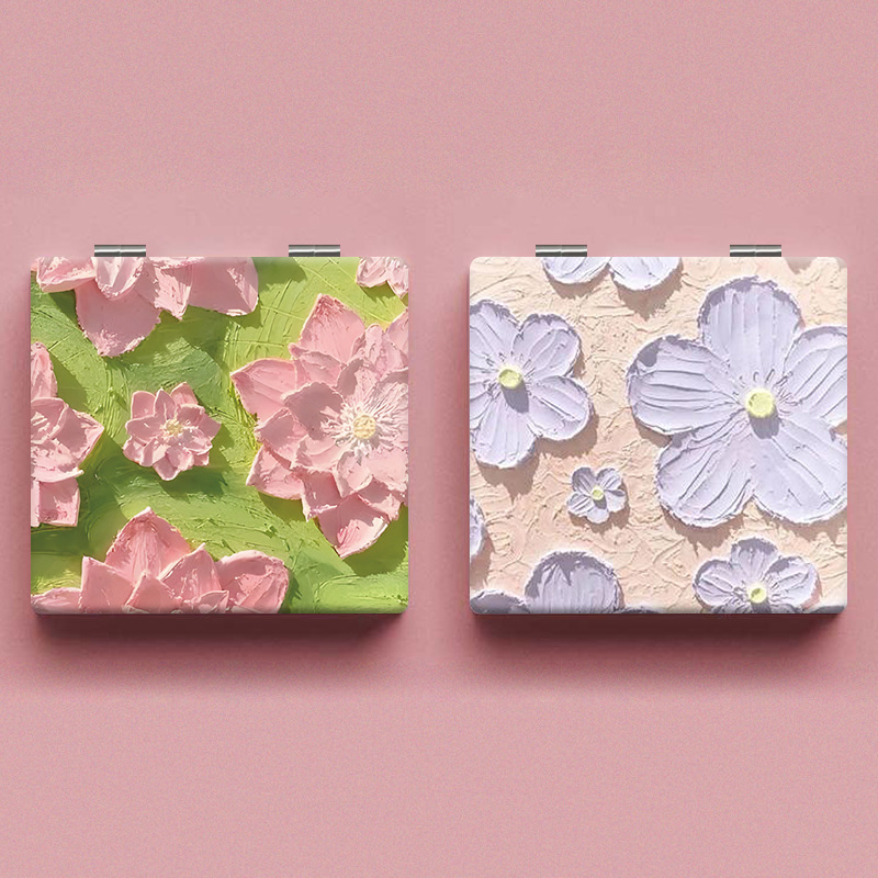 油画花朵饭收纳折叠镜子校园学生卡随身便携美颜手持课桌