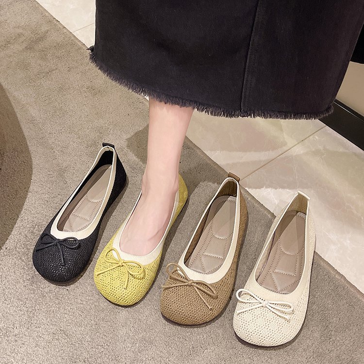 夏季新款飞织单鞋蝴蝶结圆头浅口豆豆鞋拼色透气女鞋