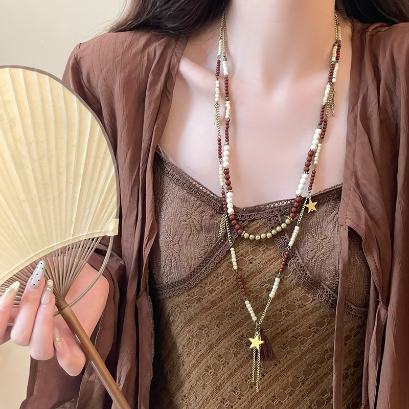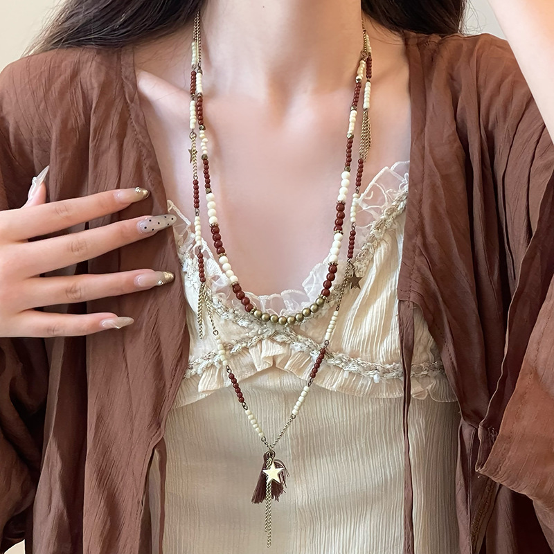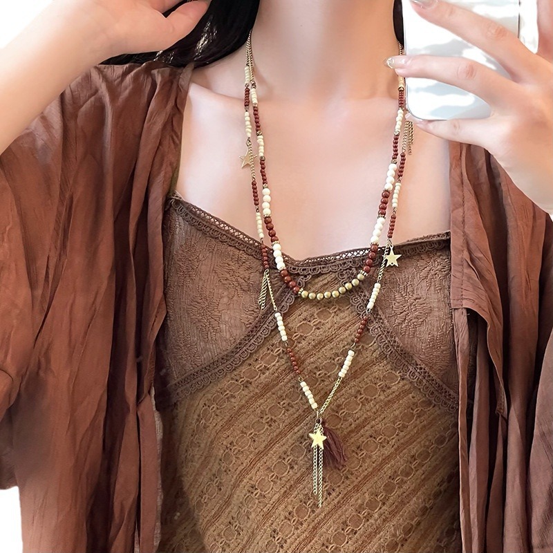 咖色串珠星星流苏项链女民族风双层叠戴毛衣链复古高级感颈链配饰