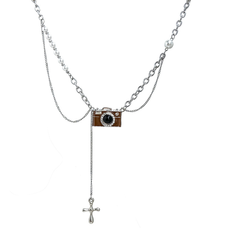 复古棕色相机流苏钛钢项链女甜酷辣妹风珍珠卫衣链设计感叠戴配饰