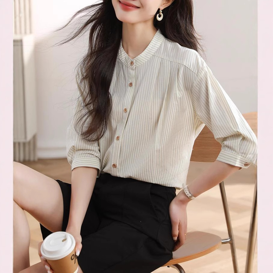 25新款圆领条纹七分袖衬衫女夏季百搭气质休闲宽松显瘦设计感上衣