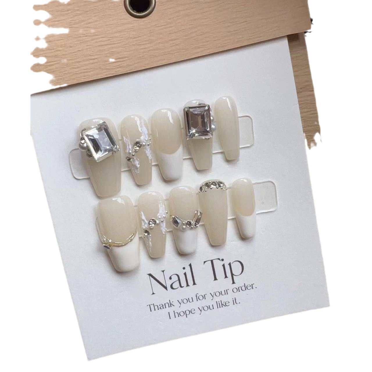 手工美甲穿戴甲假指甲贴片显白裸色爆闪方钻魔镜白色法式石膏甲片