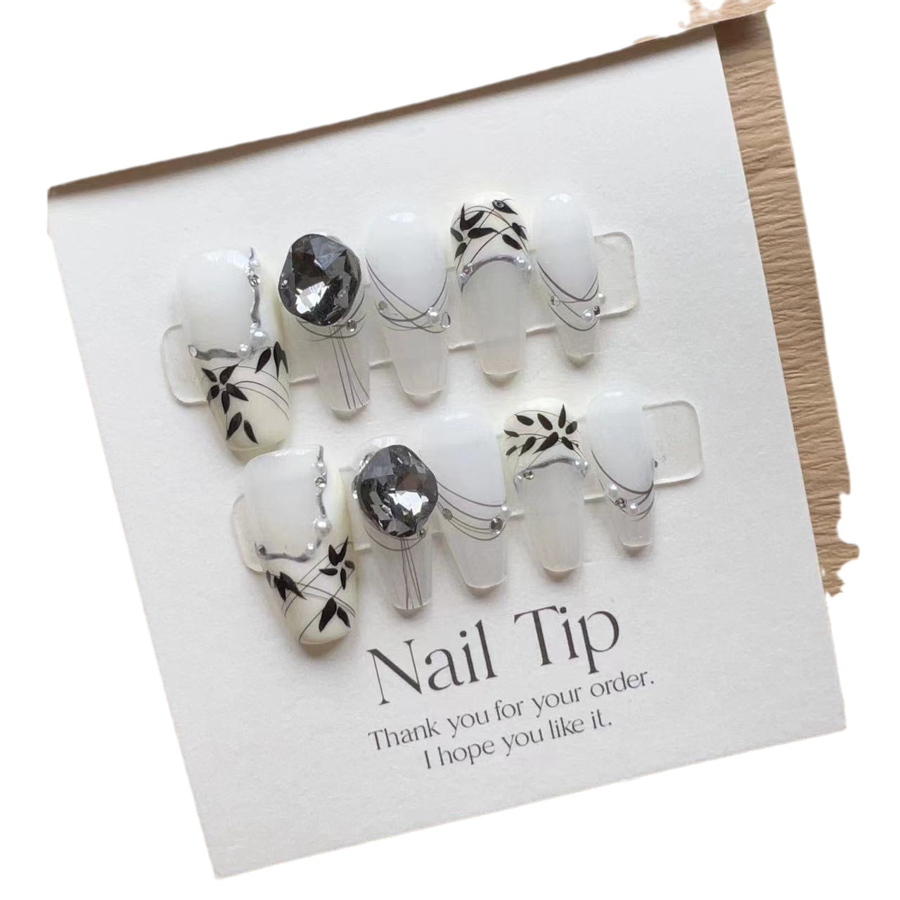 手工美甲穿戴甲假指甲贴片美甲成品国风水墨竹叶爆闪钻奶白色拉线