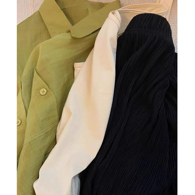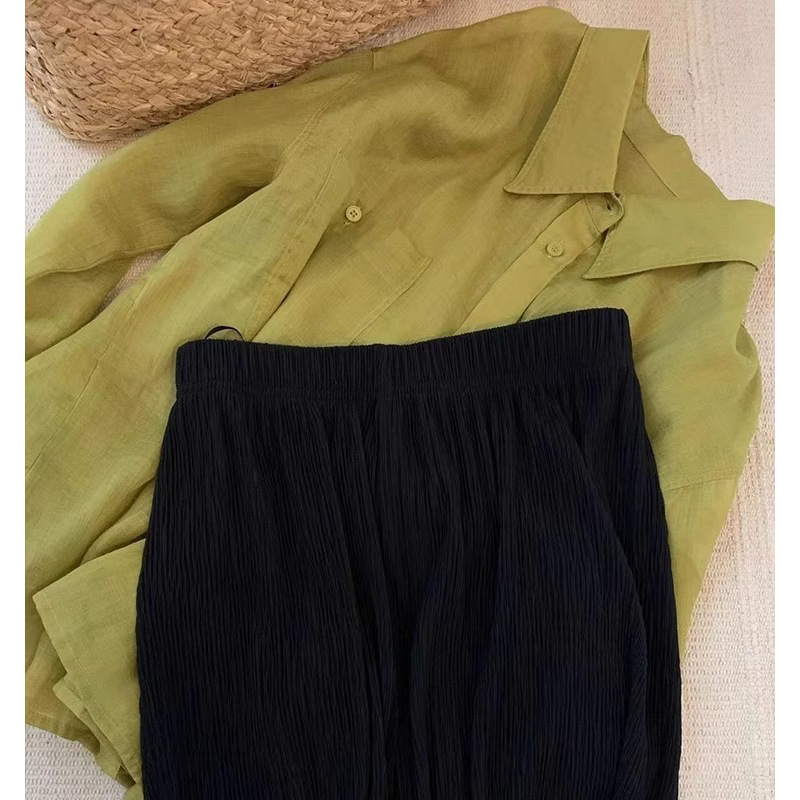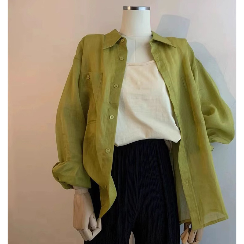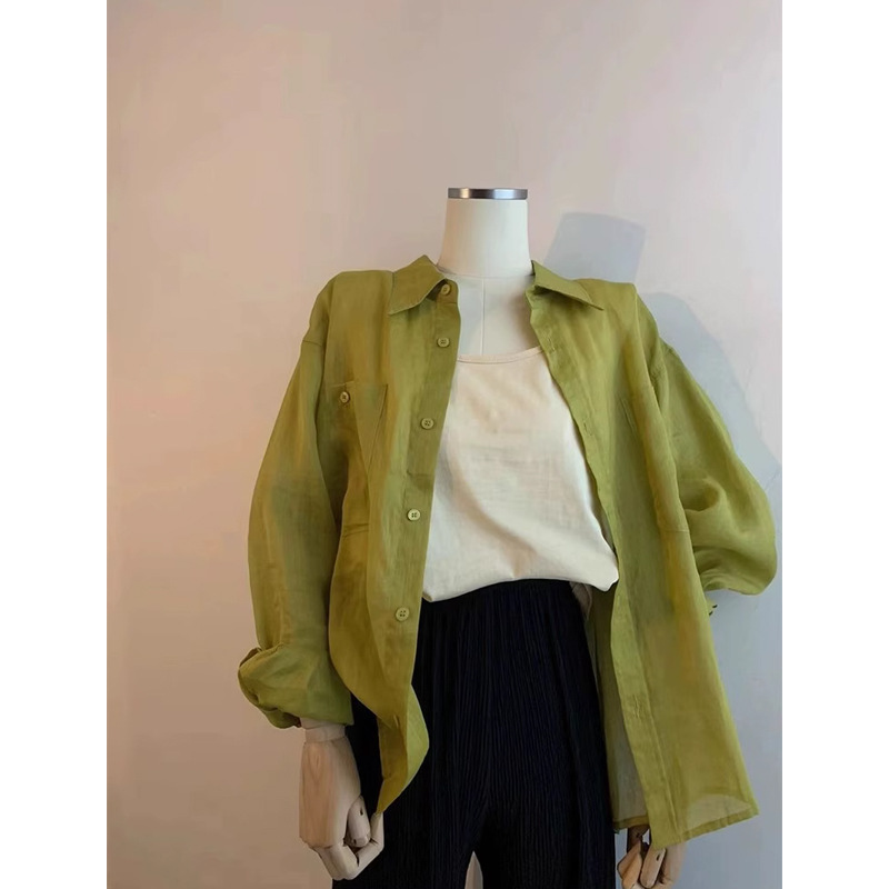天丝亚麻芥末绿衬衫女薄款长袖年新款法式设计感小众防晒衬衣