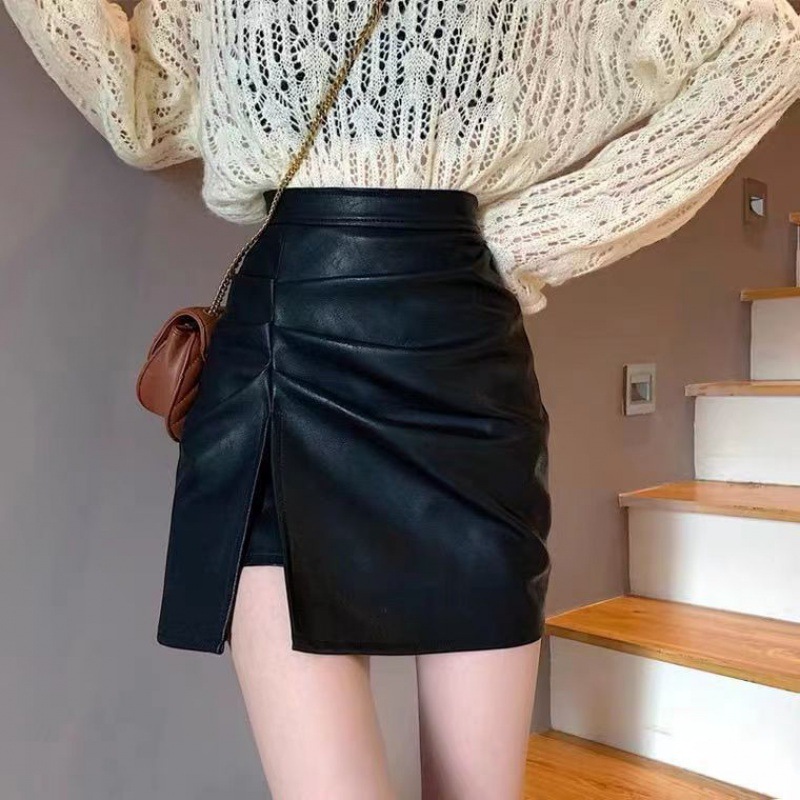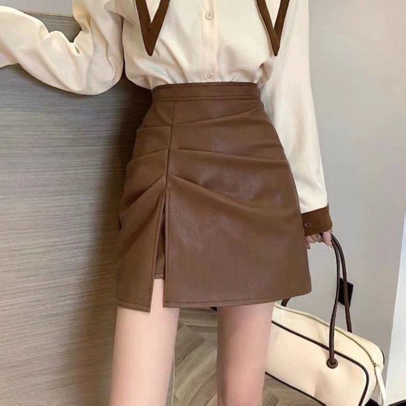 开叉褶皱PU小皮裙女显瘦半身裙高腰防走光遮胯a字裙包臀短裙子女