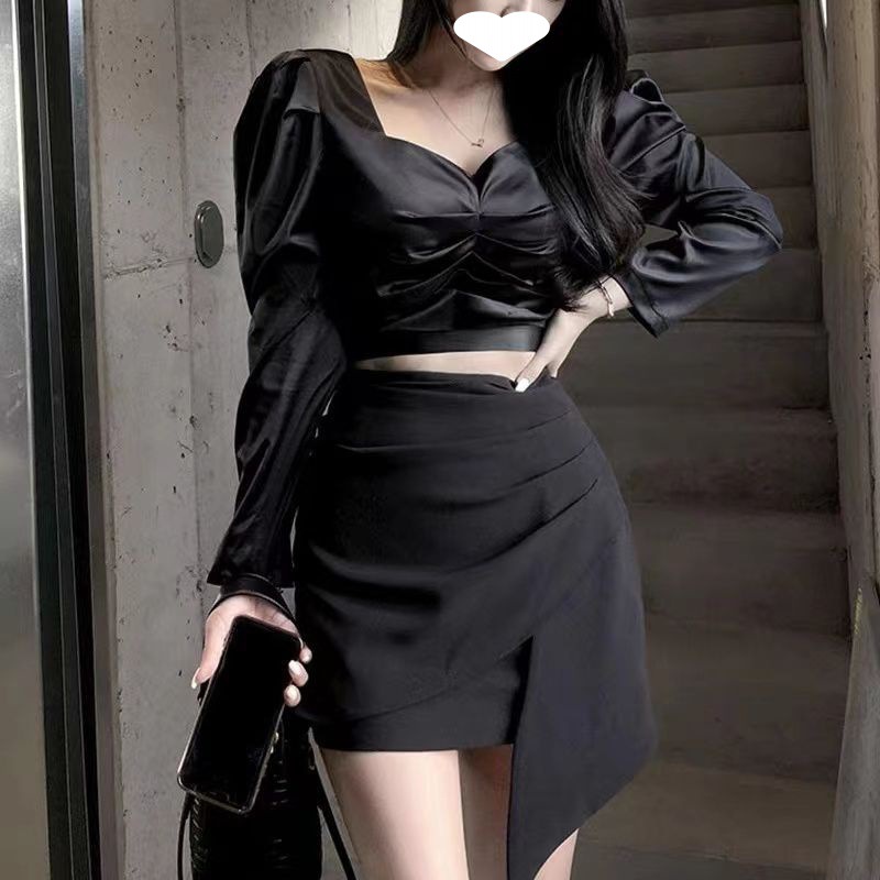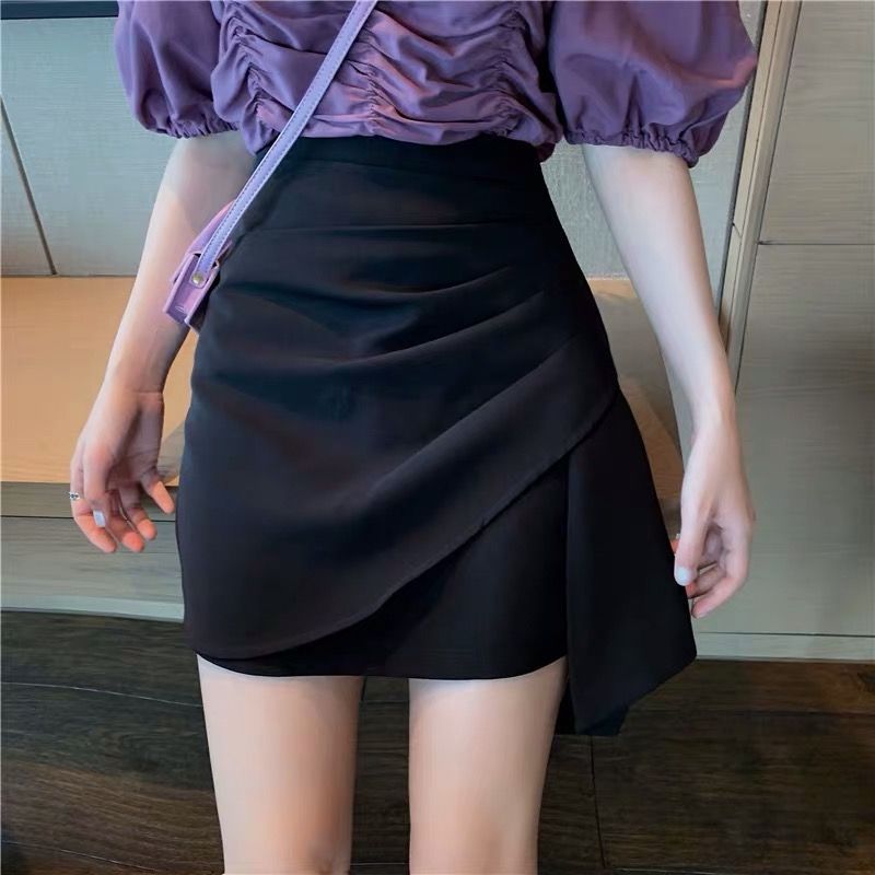 不规则褶皱半身裙春夏显瘦高腰a字裙韩版黑色包臀裙西装短裙