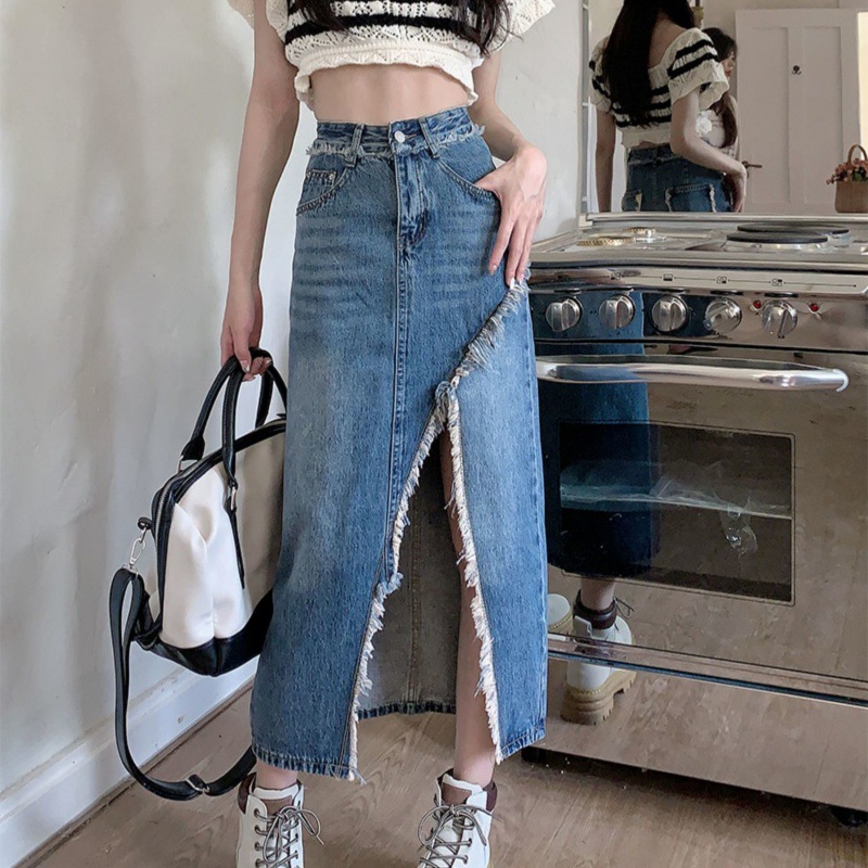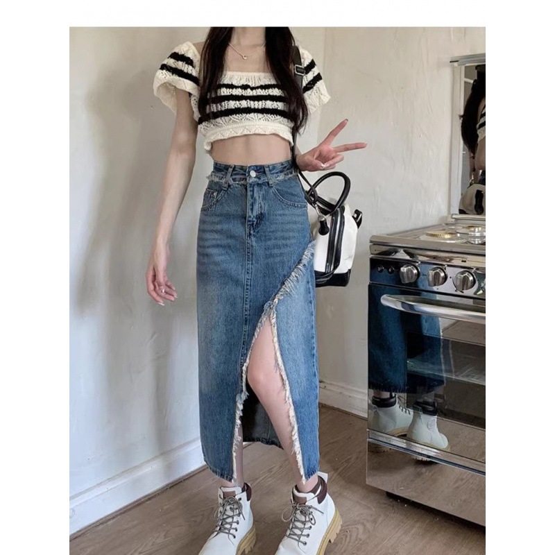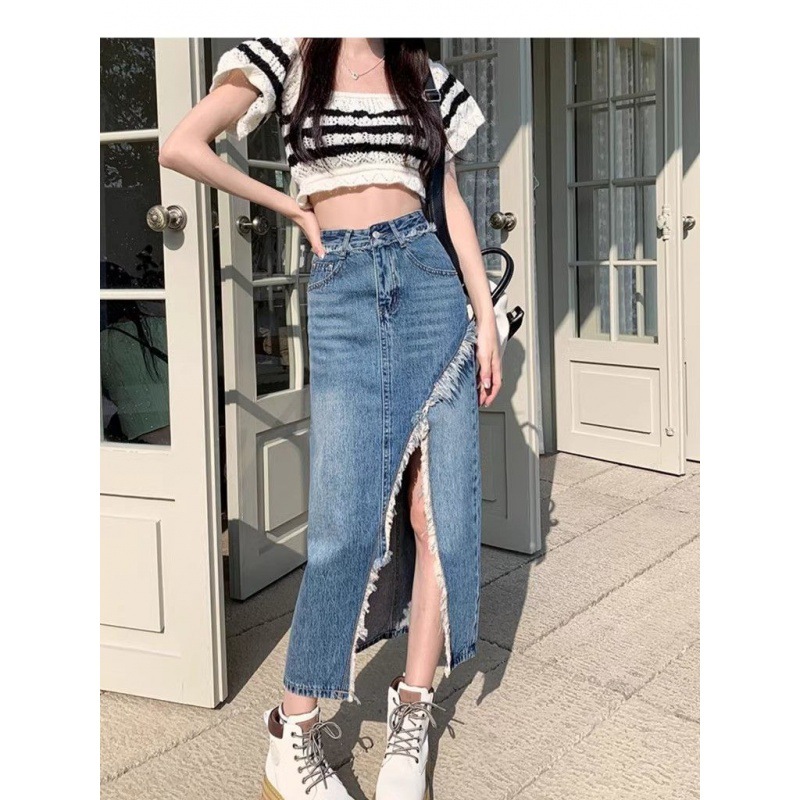 牛仔开叉半身裙夏季新款ins风高腰遮肉a字包臀复古毛边牛仔裙