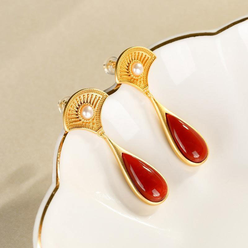 S925银古法金珐琅耳坠复古有气质百搭优雅扇形珍珠女士耳钉耳饰