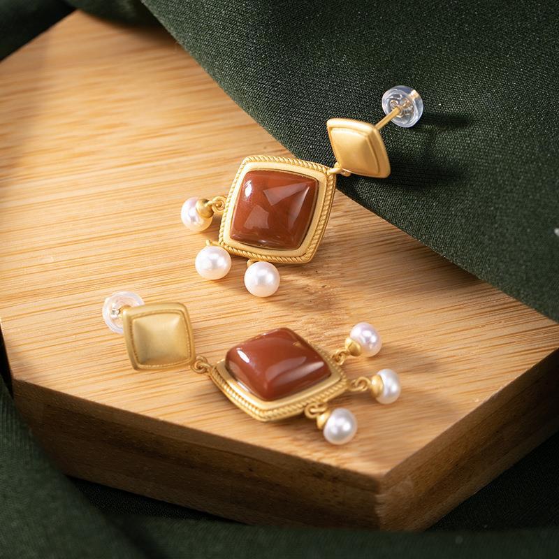 复古镶嵌南红玛瑙几何镀金小巧耳饰小众轻奢天然珍珠女耳钉
