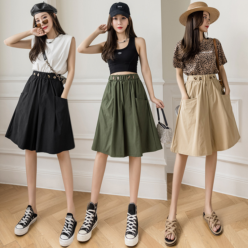 纯色五分阔腿裤女裤夏季高腰宽松外穿显瘦口袋中裤休闲裤裙