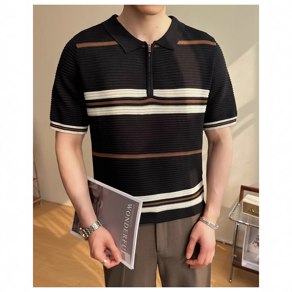 冰丝条纹针织短袖POLO衫男士2025夏季透气休闲宽松翻领T恤保罗衫