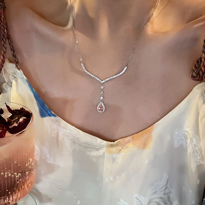 气质轻奢高级感粉色锆石水滴吊坠项链女小众设计感百搭颈链锁骨链