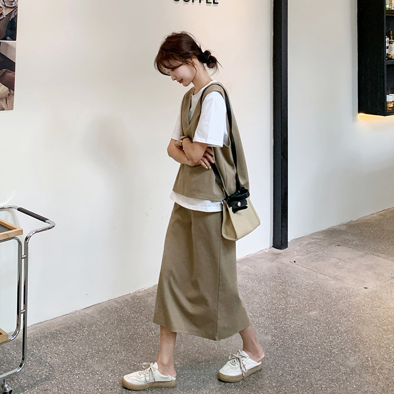 卡其色休闲套装裙女夏季气质高级假两件T恤半身裙显瘦两件套
