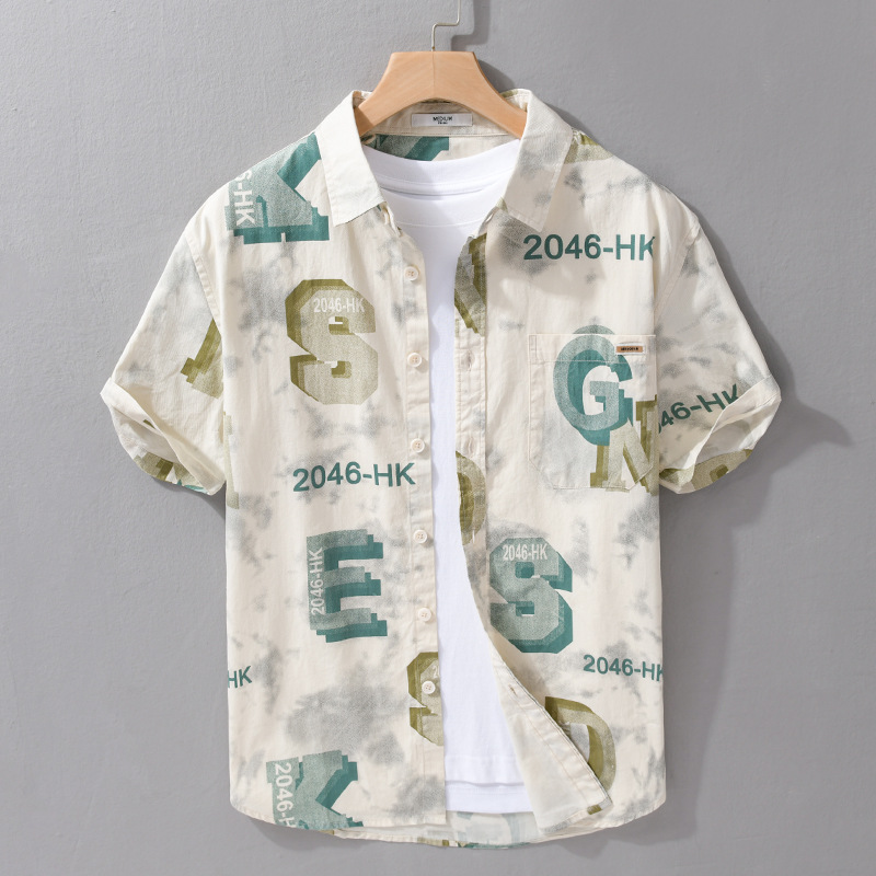 男士夏季新款五分短袖衬衫韩版潮流外套宽松潮牌印花学生休闲衬衣