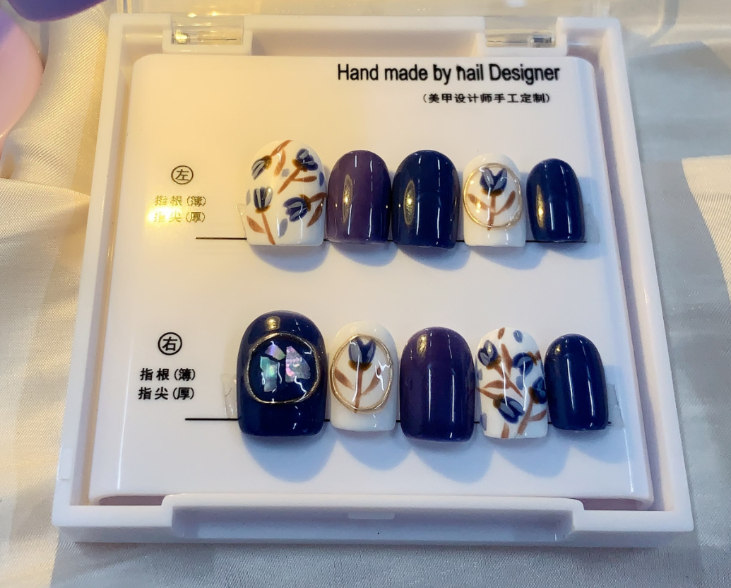 纯手工穿戴甲片美甲指甲贴片手绘花朵极光青花瓷古风雅