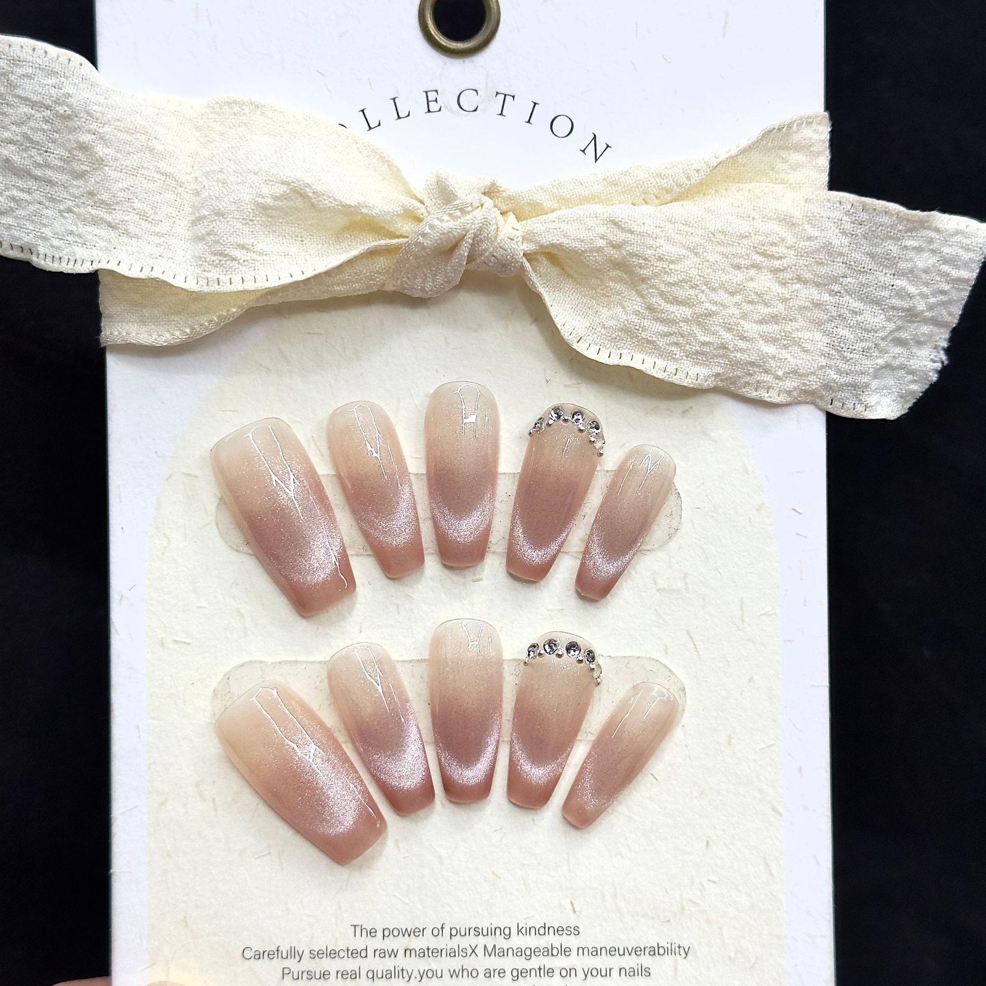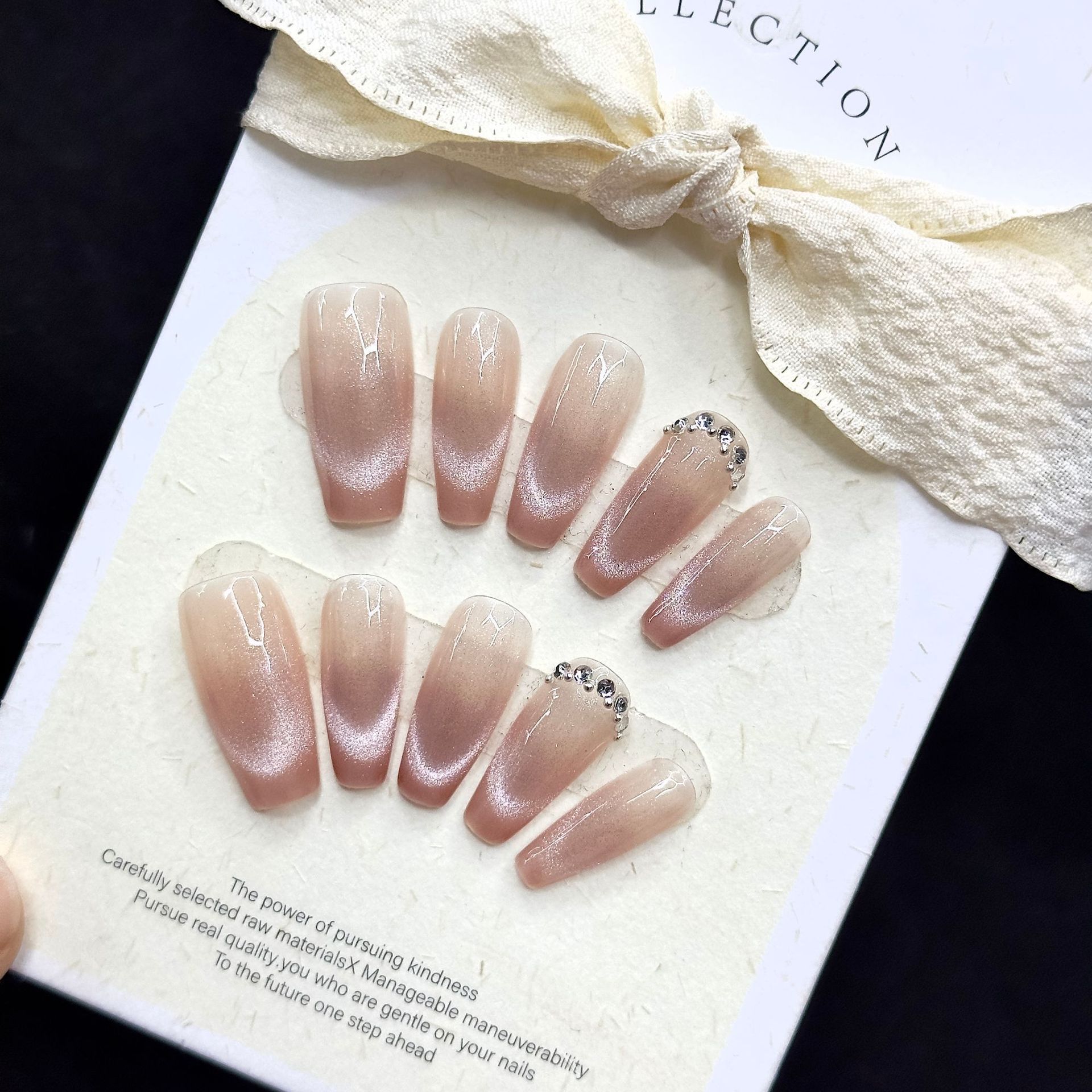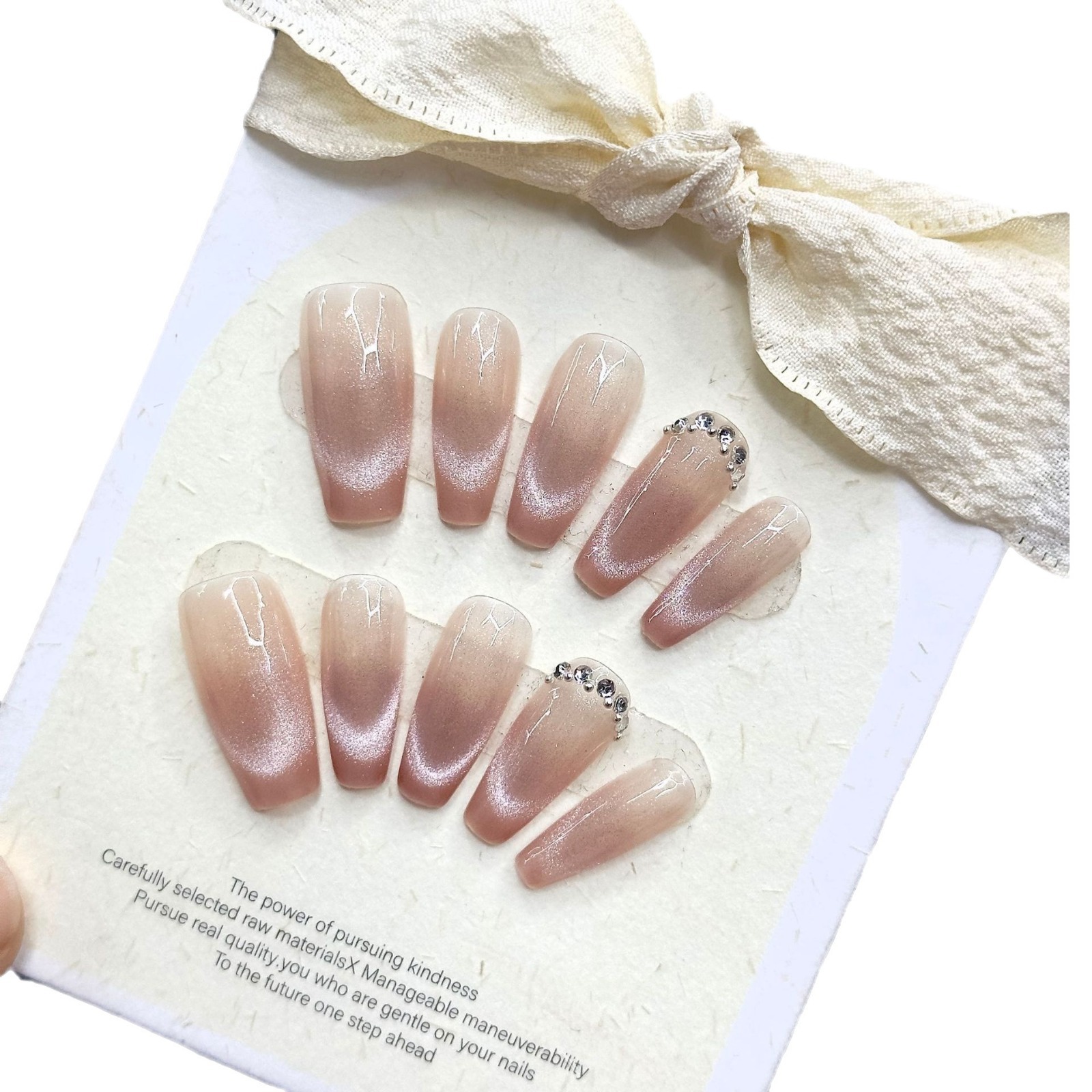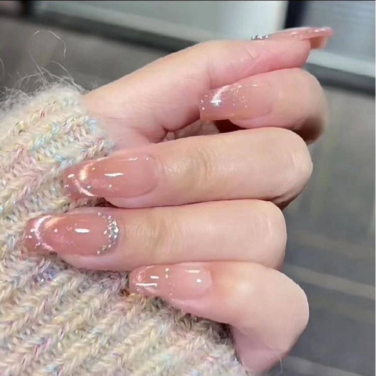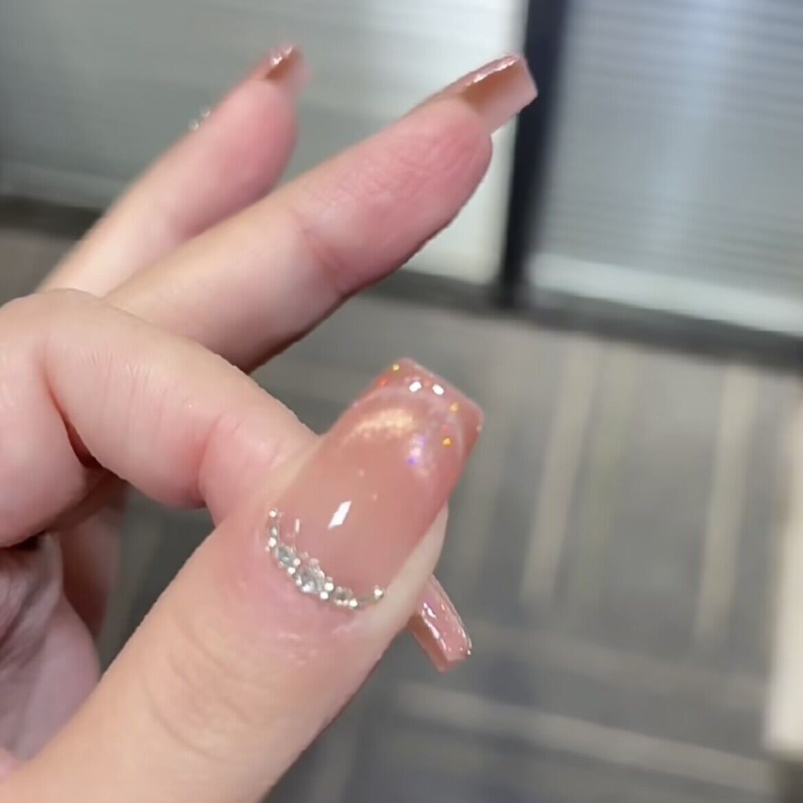 灿若繁星纯手工穿戴甲片裸色渐变法式猫眼爆闪钻气质穿戴式指甲贴