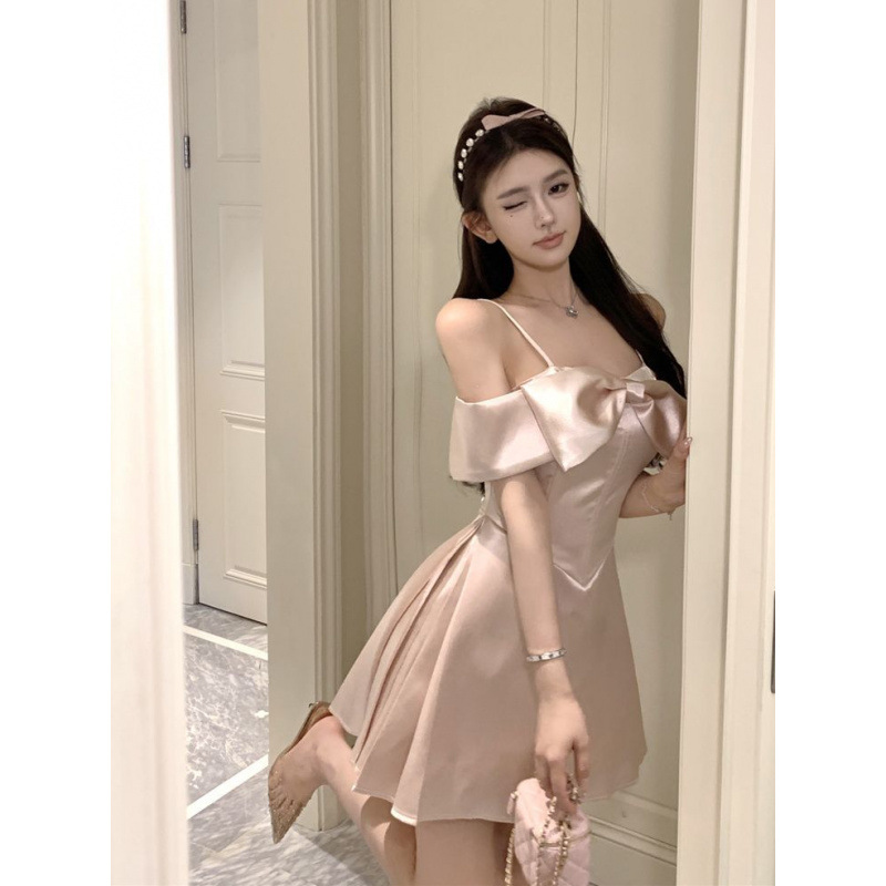 设计感抹胸吊带连衣裙女秋粉色蝴蝶结生日礼服裙一字肩公主蓬蓬裙