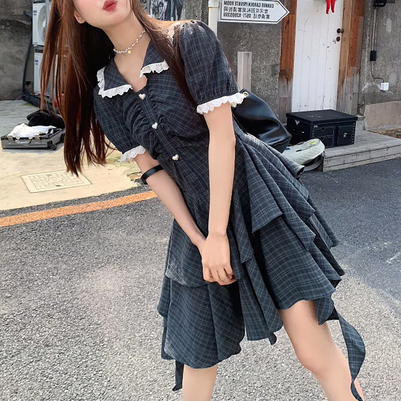 高D款春设计感不规则复古娃娃领蕾丝边格纹连衣裙女夏