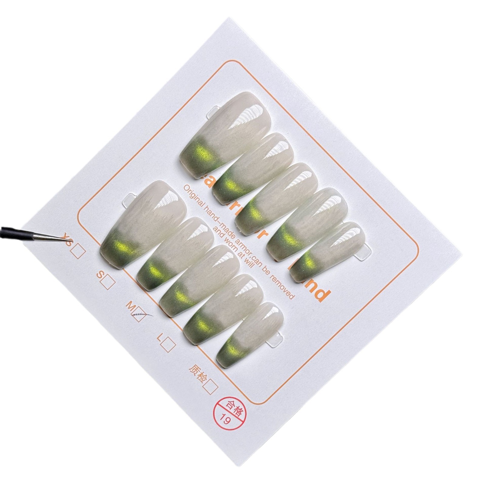 纯手工穿戴甲片美甲指甲贴片绿色猫眼法式中款绿野仙踪
