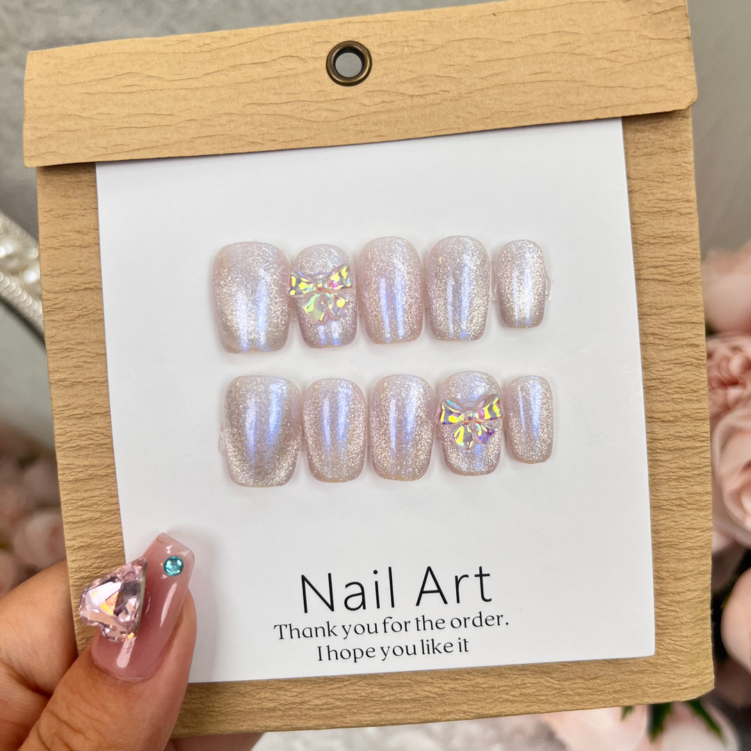纯手工穿戴甲片美甲指甲贴片蝴蝶结猫眼渐变气质紫蓝蓝简约