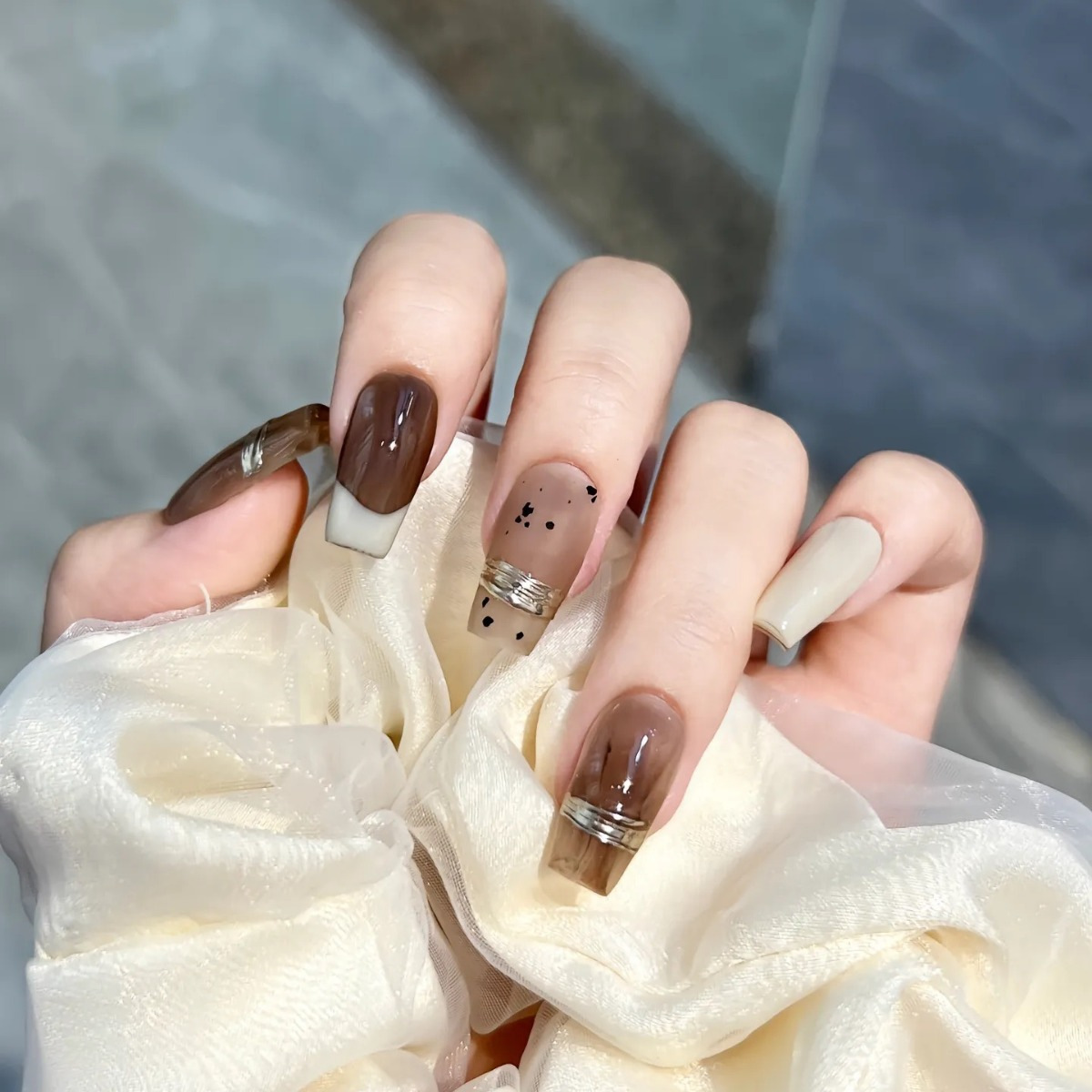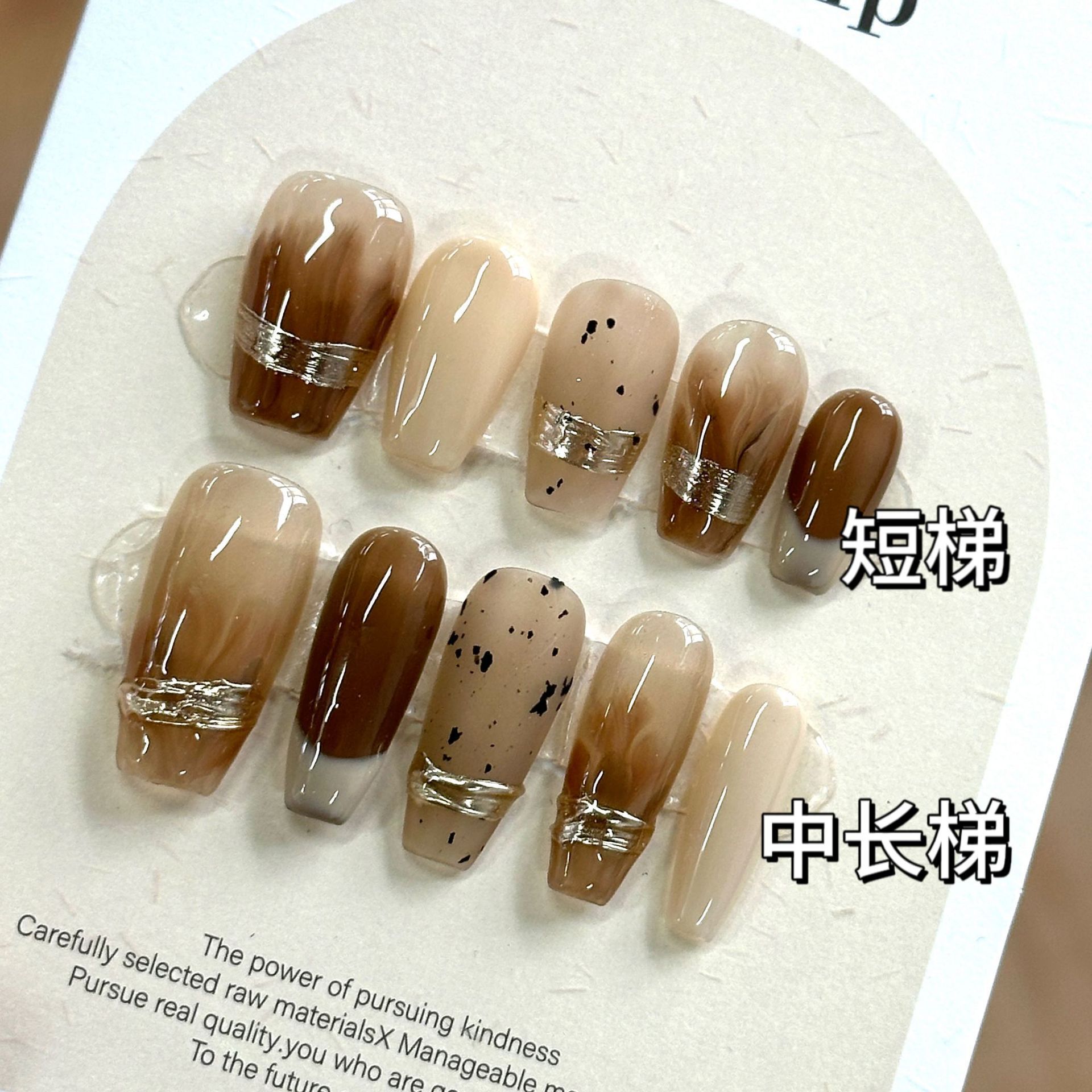 纯手工穿戴甲片美拉德冰透蛋壳焦糖法式美甲轻奢短款美甲