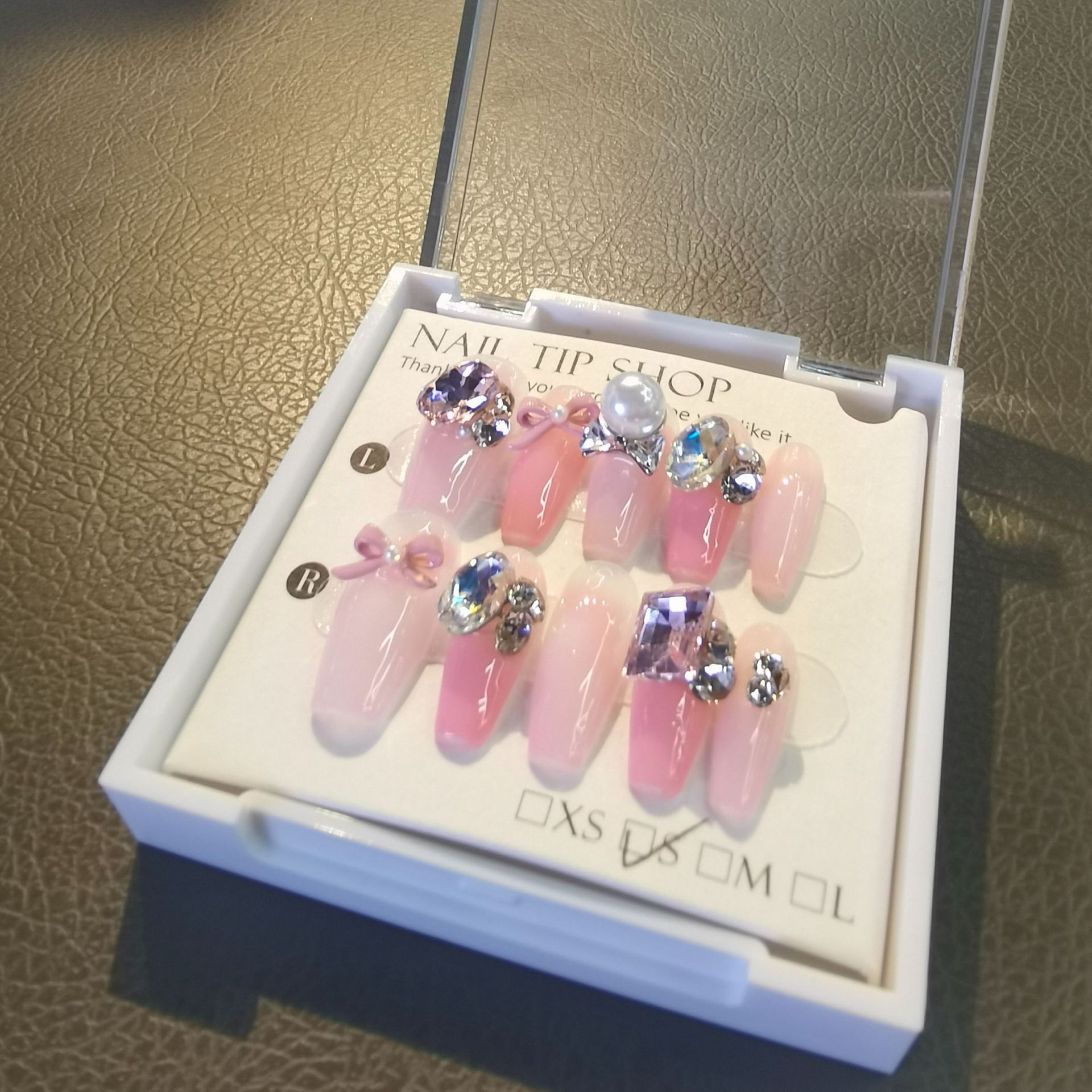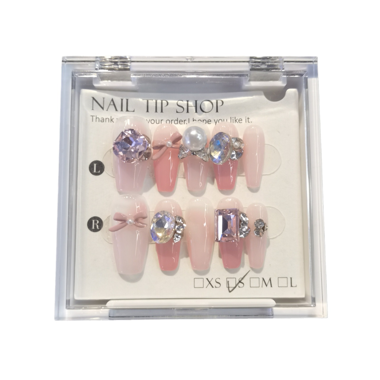 【光辉少女】手工穿戴甲美甲蝴蝶结钻饰粉色可爱甜酷晕染甲片长款
