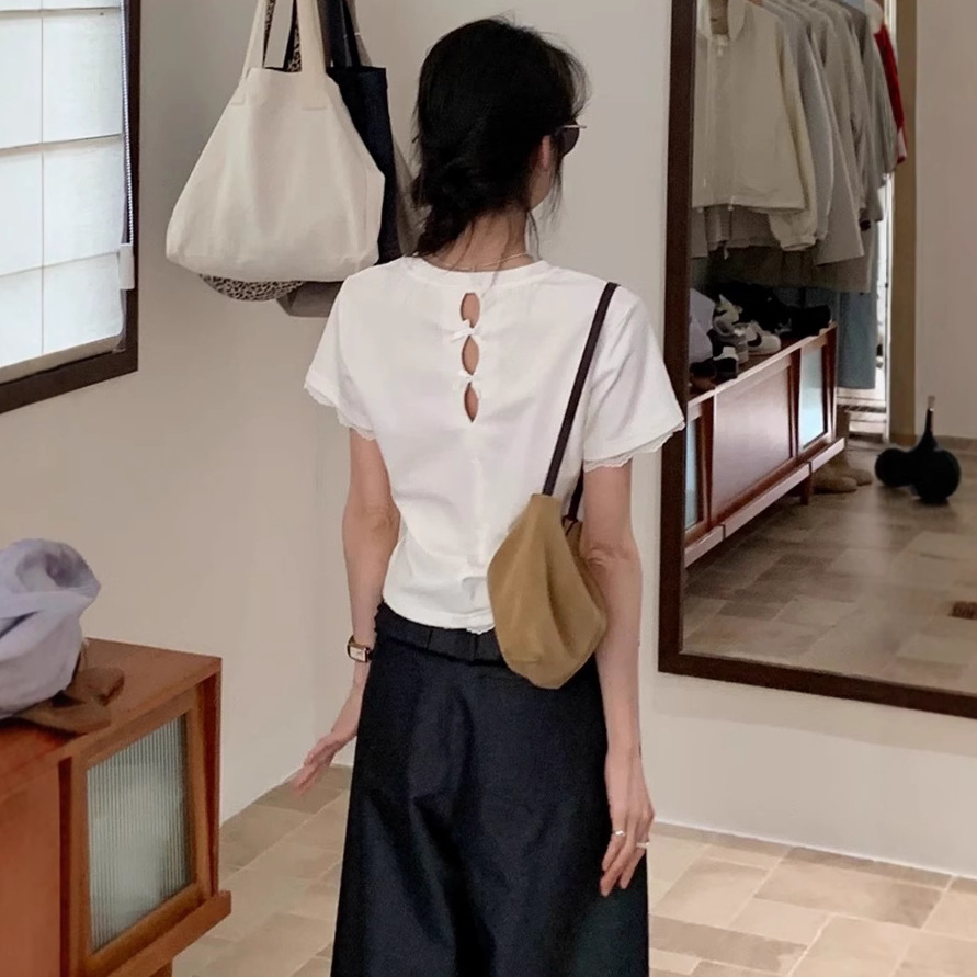 韩系花边短袖T恤女夏季后背设计感正肩百搭圆领上衣