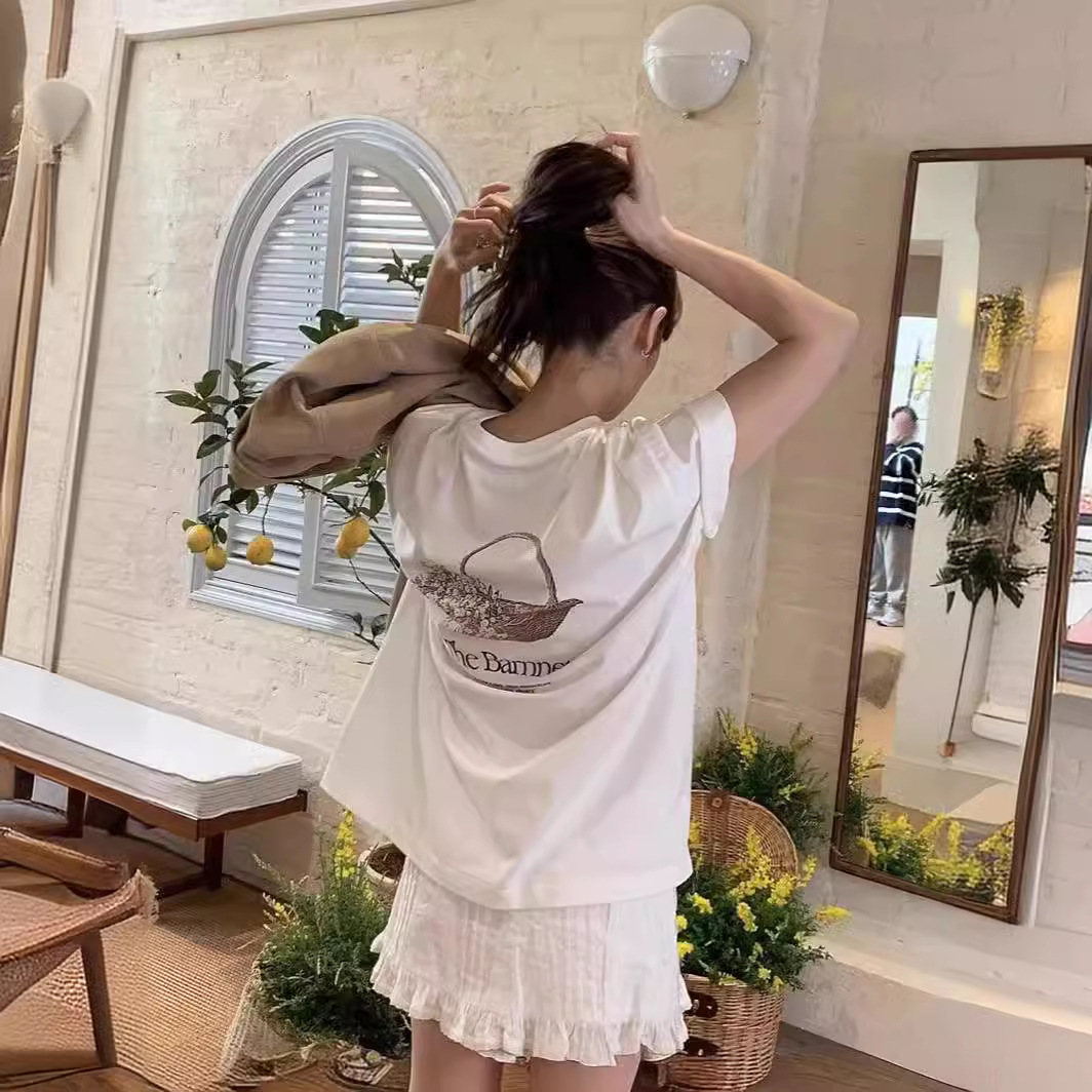 韩国八奶barnnet宽松大版原宿风后背印花花篮图纯棉情侣短袖T恤女
