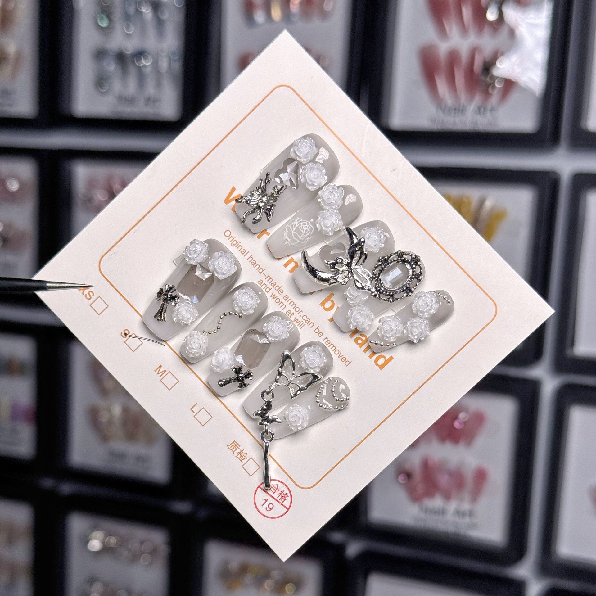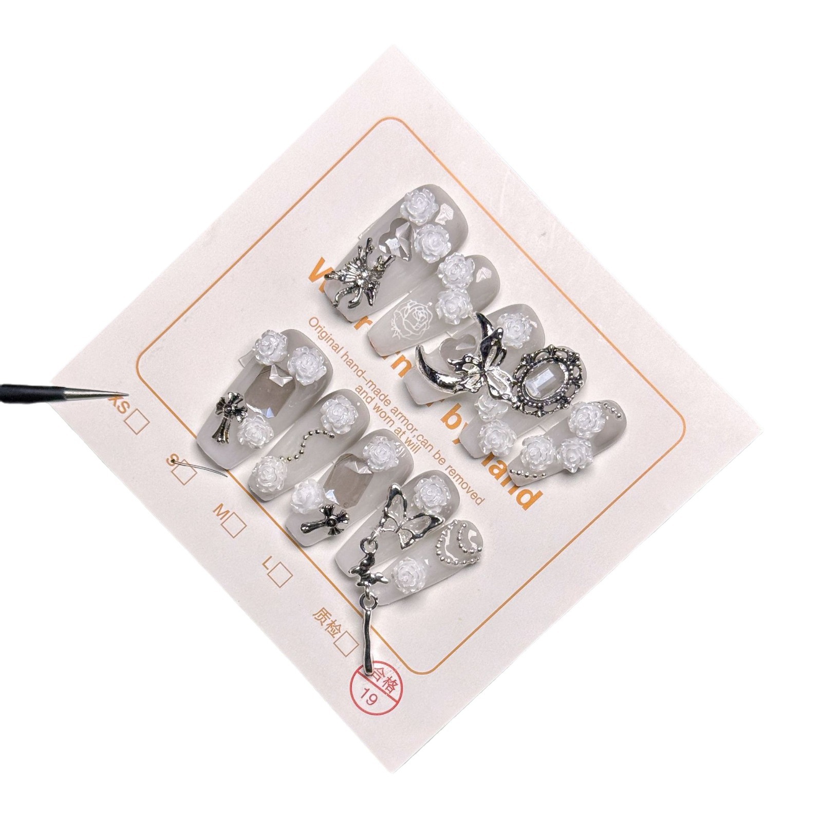 纯手工穿戴甲片美甲指甲贴片白玫瑰克罗心蝴蝶爱心大钻
