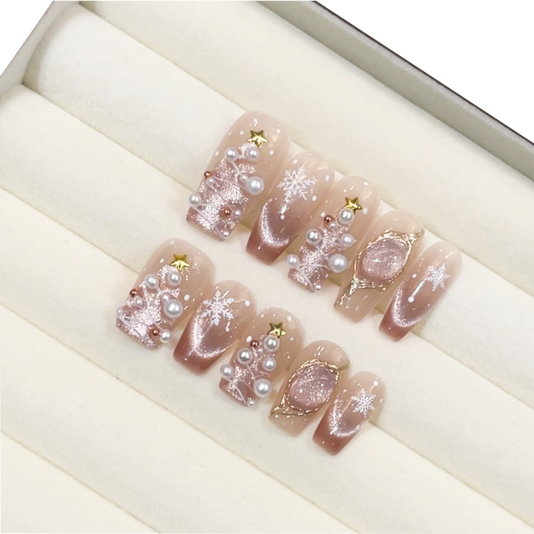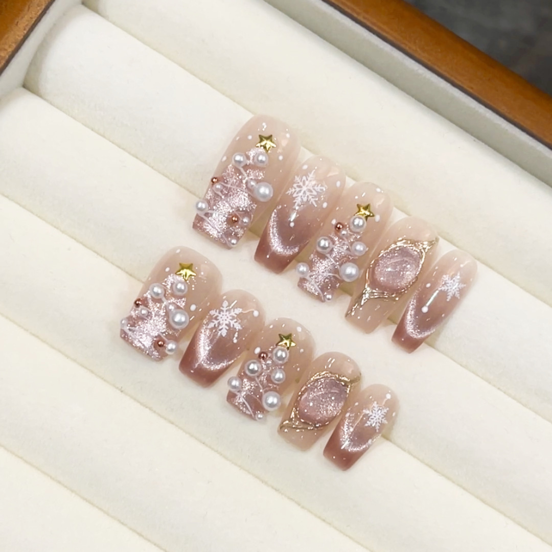 纯手工光疗圣诞初雪冬日雪花穿戴甲圣诞猫眼巴洛克风格圣诞树成品