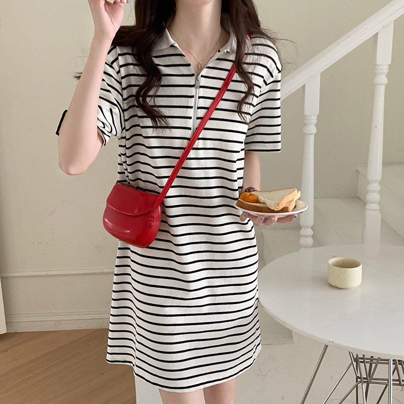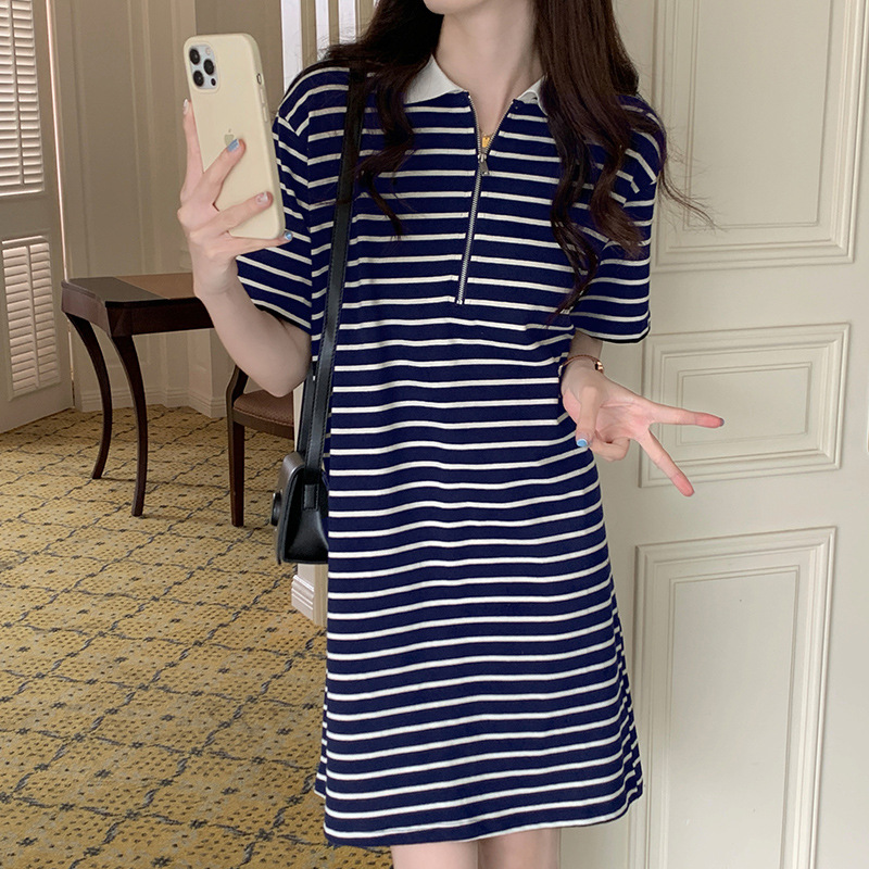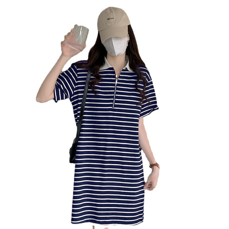 夏季新款孕妇纯棉中长款条纹连衣裙女Polo领半拉链短袖T恤裙