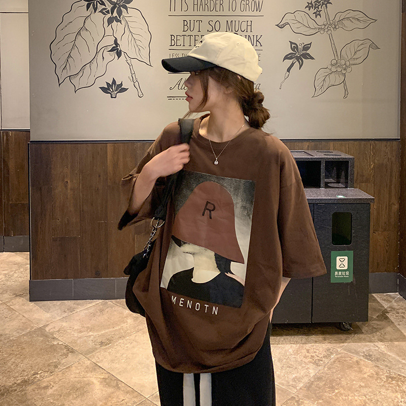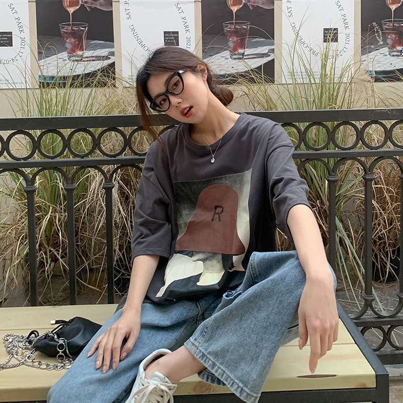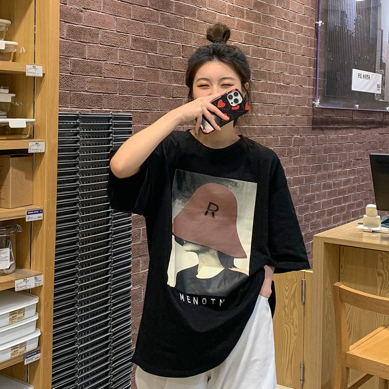 美式短袖T恤女夏季新款个性印花宽松中长款圆领正肩半袖上衣