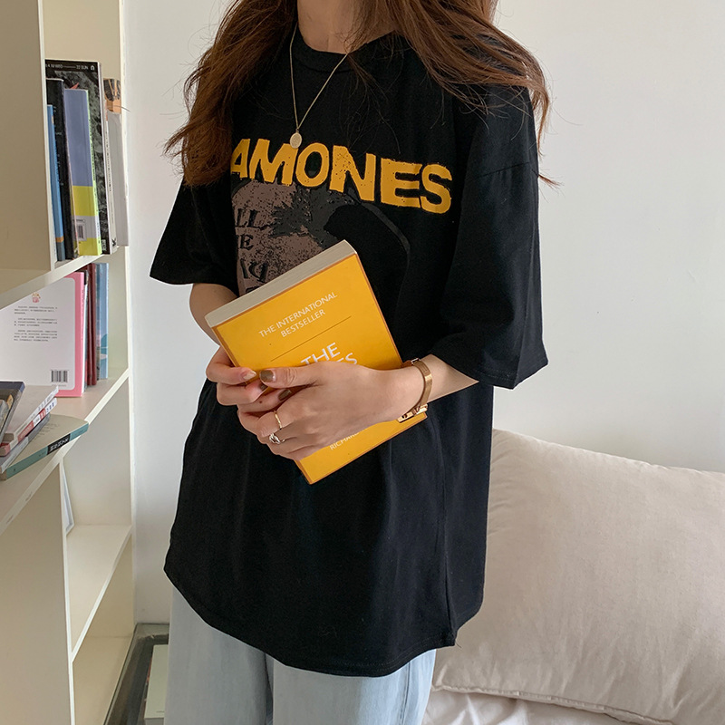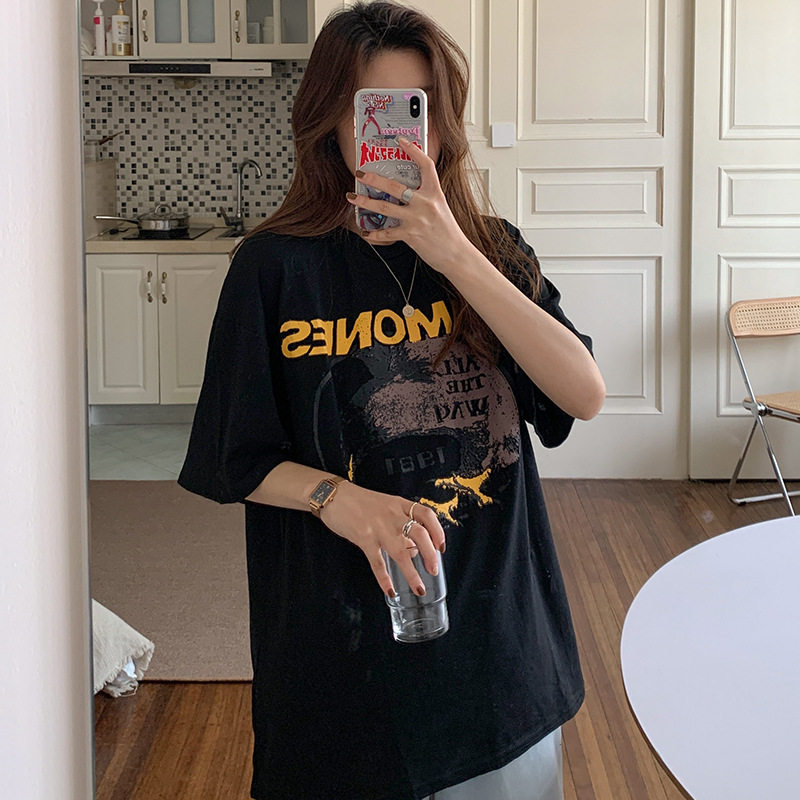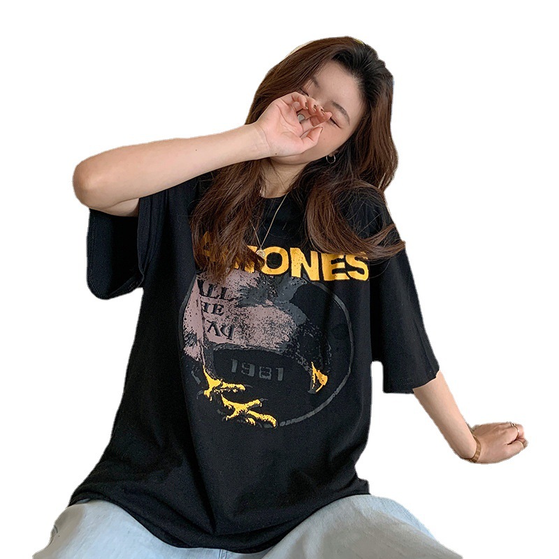 外贸批发欧货嘻哈摇滚黑色中长款短袖T恤女夏季宽松大码女装