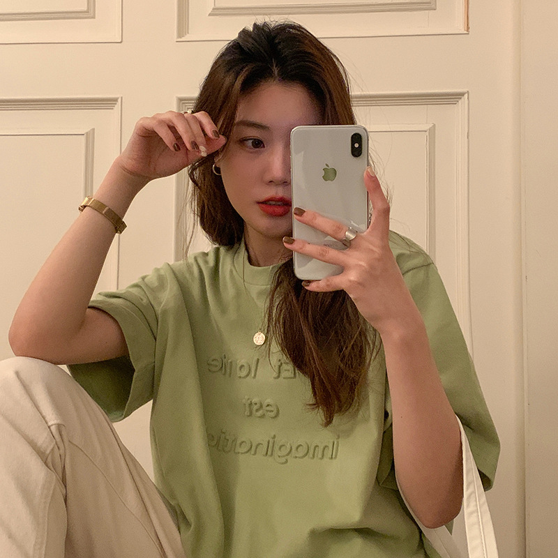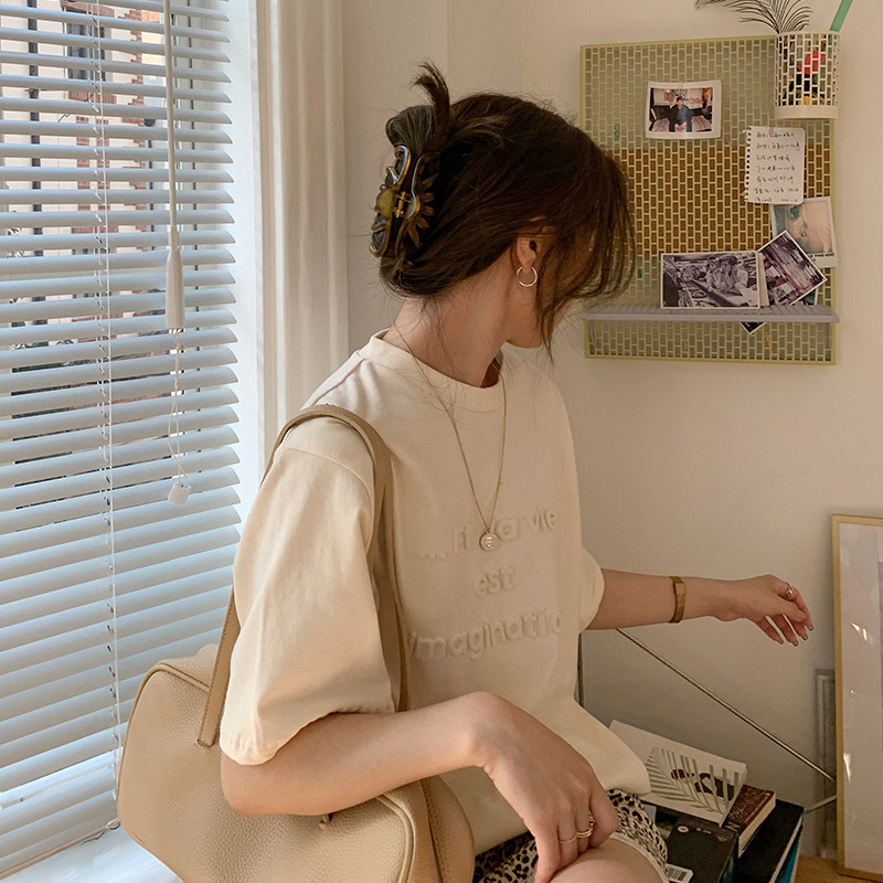 外贸批发韩版新款设计感3D凹凸立体字母宽松中长款半袖正肩T恤夏