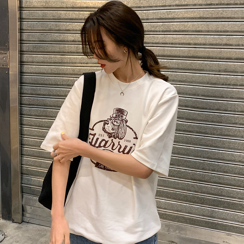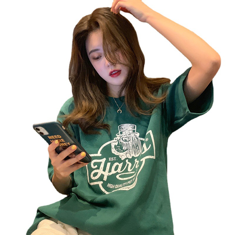 外贸批发韩版宽松慵懒短袖T恤女春夏美式复古圆领五分袖上衣